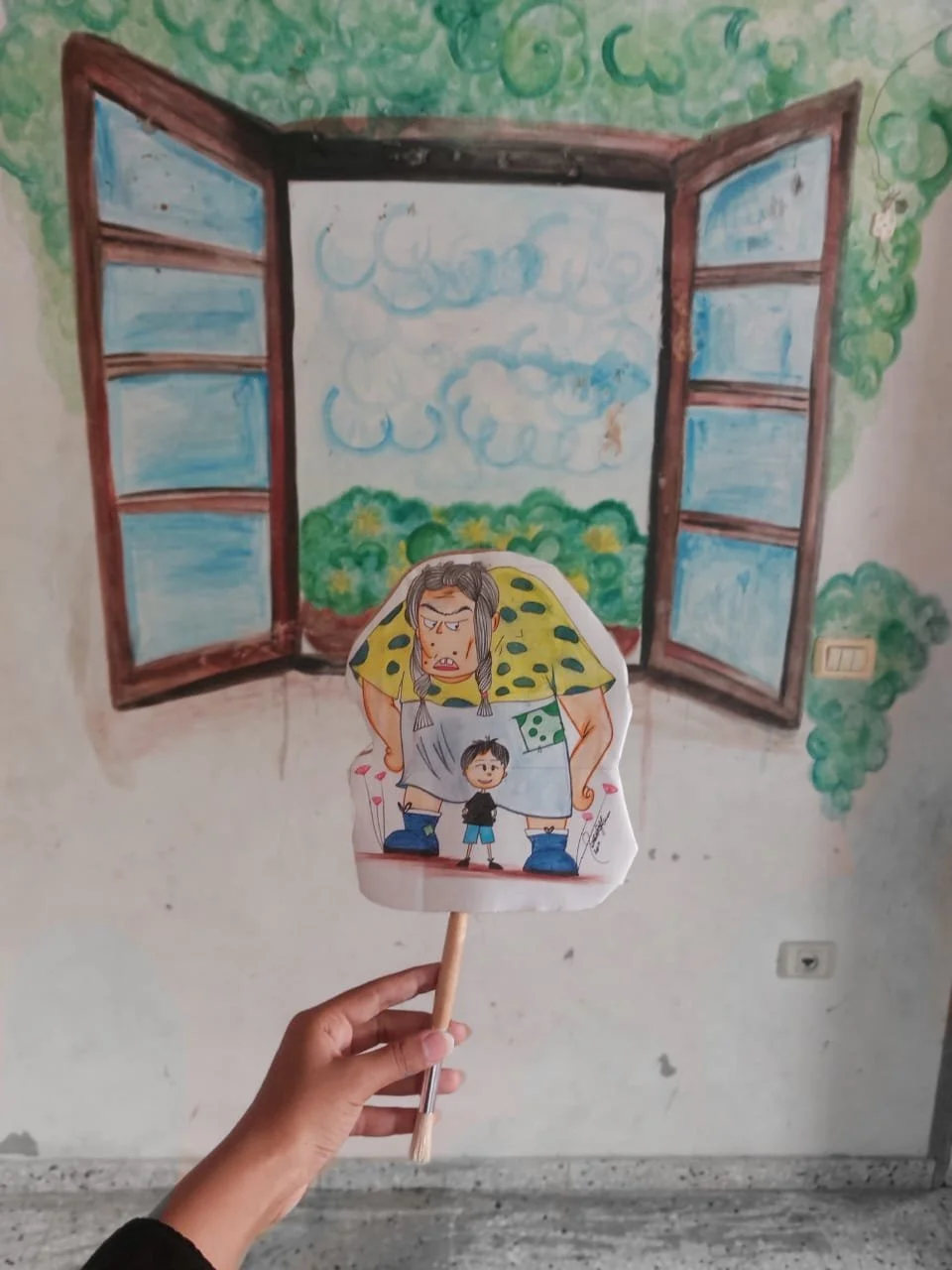 During the session, Mrs. Sahar shared one of the stories from our book Stories Reborn β the tale of Noss Nassees. Together, we brought the storyβs characters β the ghoul and Noss Nassees β to life through colorful wall paintings.