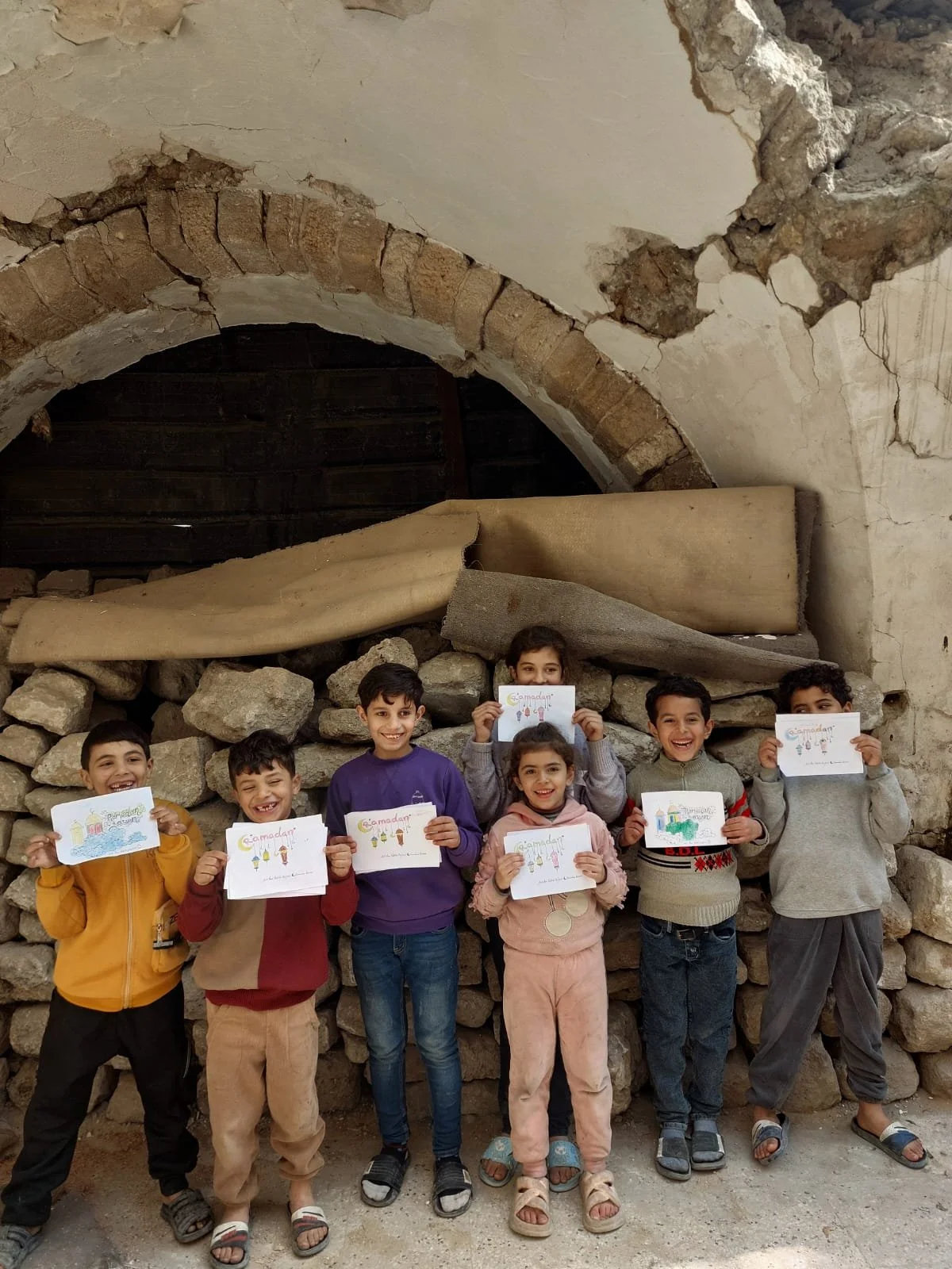 Instead, in a small courtyard surrounded by carefully stacked stones from damaged buildings, children gathered with their families — creating art among the ruins, laughter echoing through the narrow alleys. 🕌🌙