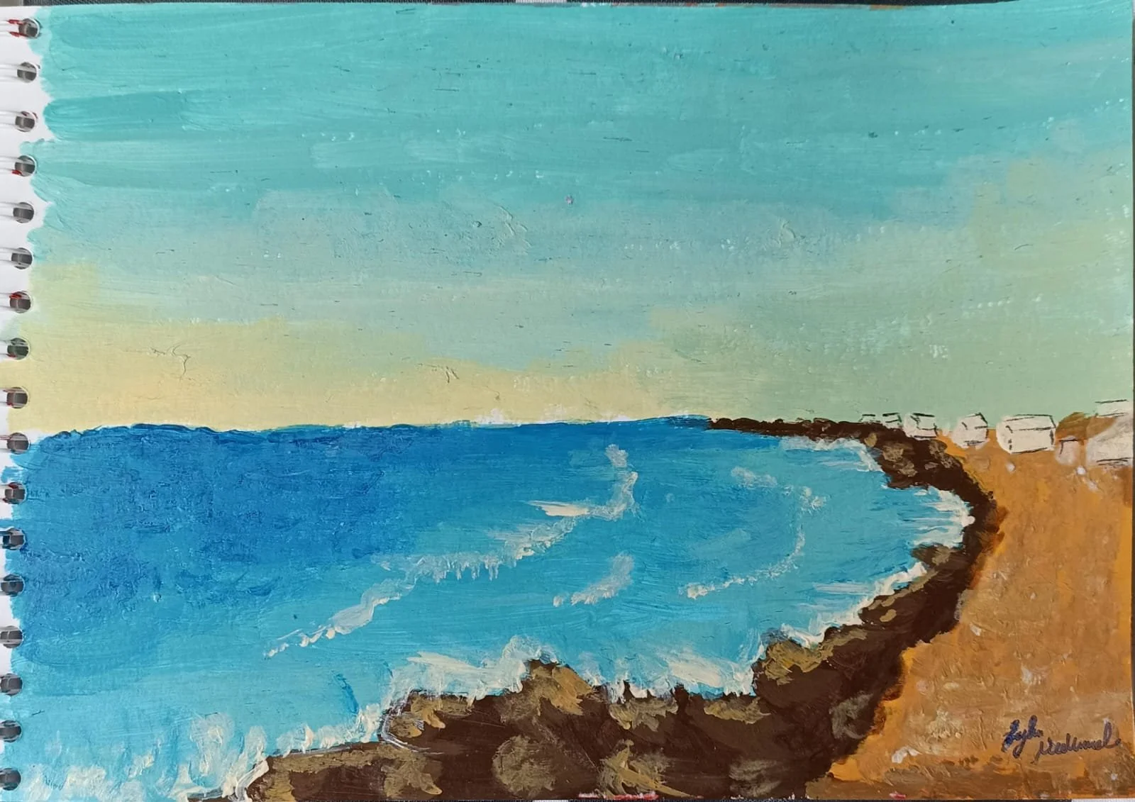 This time we have two more paintings – the first is another by Leyla. It is of the beach at Gaza. Leyla was helped by a crowdfunder to leave Gaza a few months ago. She left two days before the Rafah crossing was closed, and is now studying at Debrecen University in Hungary. How she misses the sea! You will see from the painting how much it means to her – as it does to all the people of Gaza. You can see, in the painting, the tents of the people who have lost their homes. Her own family was there for a while.